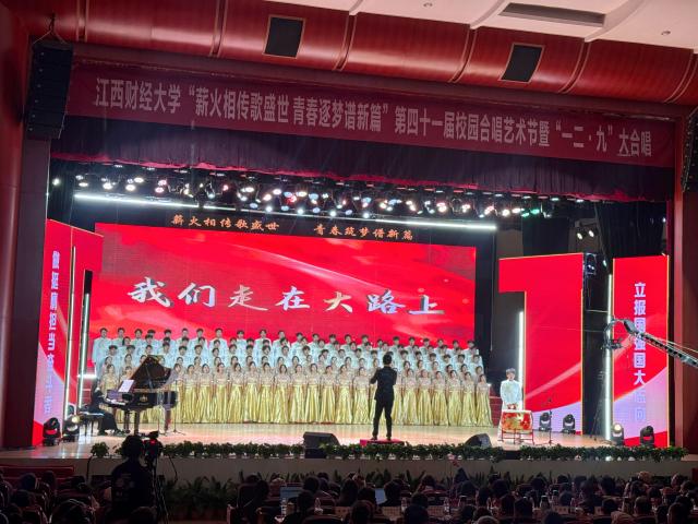 12月14日,蛟桥大礼堂内歌声飞扬、激情澎湃,江西财经大学第四十一届校园合唱艺术节暨“一二·九”大合唱活动在蛟桥大礼堂隆重举行。体育学院与外国语学院学子携手登台,以一曲昂扬奋进的《我们走在大路上》献礼时代,用嘹亮歌声诠释青春担当,最终荣获三等奖。